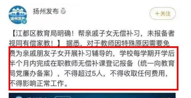 在有偿补课方面,各地的教育部门也都出台了相关的规定,明令禁止在职教师的有偿补课,给老师划了一道红线,不容越过。但是对于在职教师来说,有一种补课是允许的,却需要附带一定的条件。那就是给亲戚家或朋友家的孩子免费补课。扬州市的教育局对此就做出规定。一起来看下需要满足什么条件。