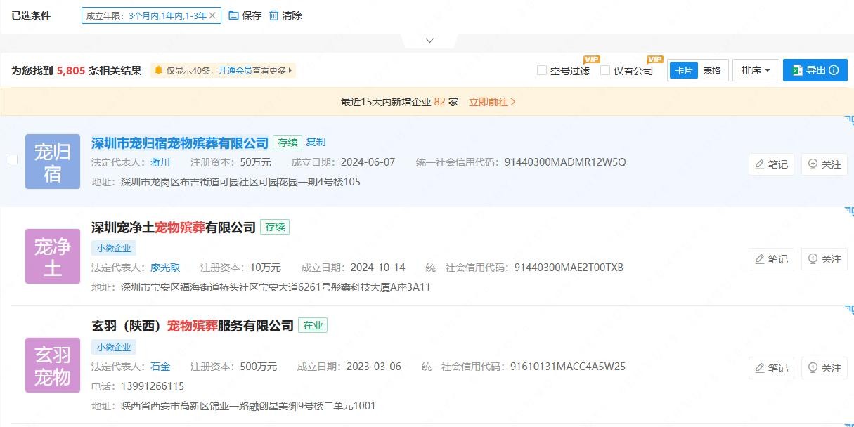另一方面,企查查平台显示,截至目前,国内现存宠物殡葬相关企业逾8000家。其中,近三年新增注册相关企业接近4000家,从数据可以直观地看出宠物殡葬行业的快速崛起。