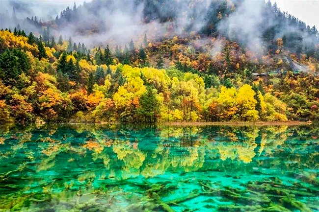 金秋,无疑是九寨沟最美的时节,九寨归来不看水,此时湖面颜色的层次,加上岸边金叶的倒影,熠熠生辉,如梦如幻,行走在水边林中,如徜徉在世外仙境,沐浴着蕴蕴雾气,使人神清气爽。