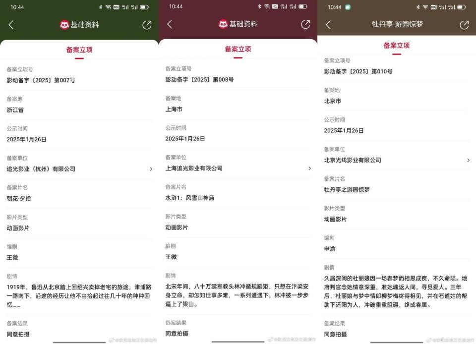 去年备案的动画电影项目中,不少古典文学作品也受到关注,改编自戏曲《牡丹亭》的《牡丹亭之游园惊梦》由光线影业立项,改编自鲁迅的《朝花·夕拾》由追光影业立项,同样由追光影业立项的《水浒1:风雪山神庙》则改编自经典名著《水浒传》,后两部影片均由曾担任“白蛇”三部曲、《长安三万里》等热门影片编剧的王微撰写剧本。