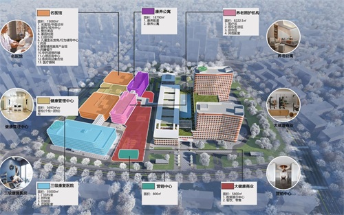 项目总投资34.5亿元,总建筑面积32.5万平方米。建设综合医院和大健康综合体,包含急诊急救、门诊楼、科研中心、实验教学、康复中心、护工培训中心等,打造成为科学、绿色、便捷、智慧的康养医疗体系。