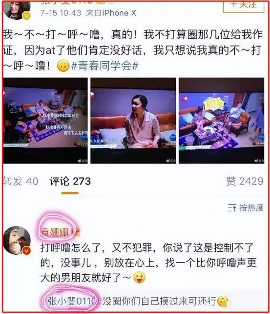 节目播出后张小斐打呼噜的问题被挂上了热搜,当时张小斐并没有什么流量,也没有什么作品,谁知道袁姗姗直接在评论区说:打呼噜又不犯罪,你找个比你呼噜声更大的男朋友不就好了