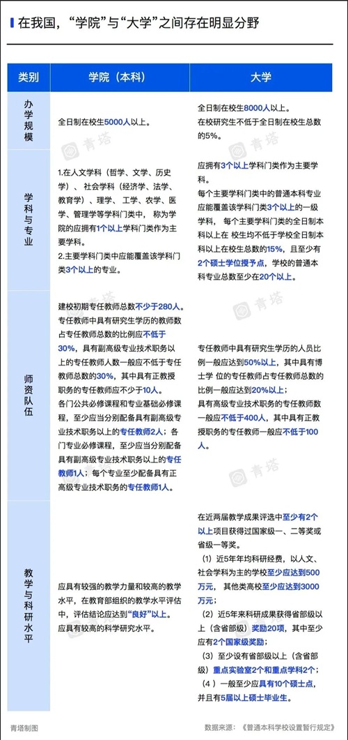 以“学院”和“大学”来说,教育部在硬件设施、办学规模、学科专业、师资队伍、教学科研等方面都有着层次分明的划分。