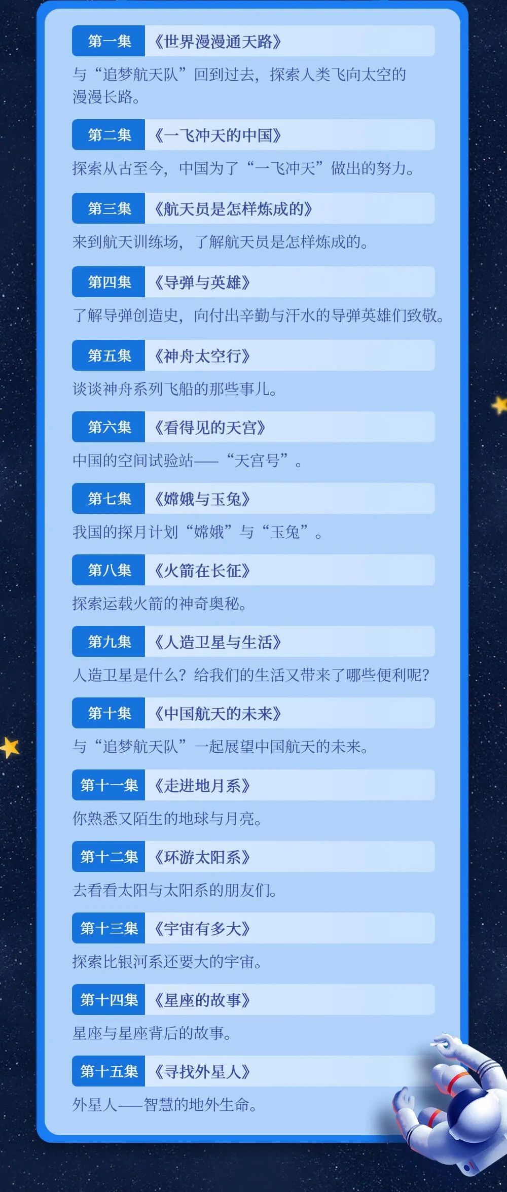 课程邀请到“嫦娥之父”欧阳自远、火箭发动机焊接中国第一人高凤林、卫星专家胡志勇等顶尖航天科学家为你的孩子保驾护航,带他们一起去探索宇宙的奥秘,来一场有趣的星际穿越之旅。