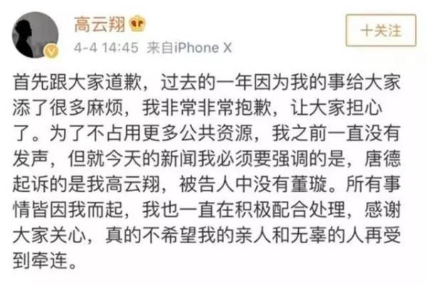 对此,爆料的网友继续给出说法,今年4月份,高云翔曾在风波后首次发文道歉,并特别提到唐德起诉的是他高云翔本人,强调被告人中没有自己的妻子董璇。