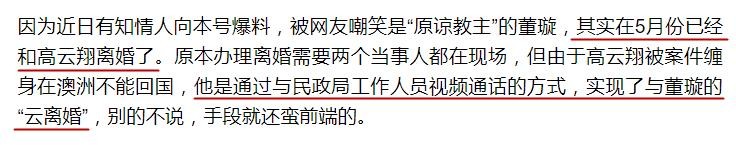 一是,爆料人称身处国外的高云翔和董璇,是通过和民政局工作人员视频通话的方式进行的“云离婚”。