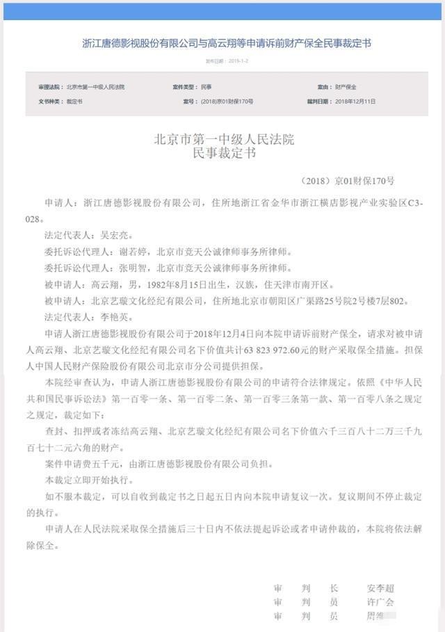 民事裁定书于今年1月发布,内容显示法院已经裁定查封、扣押或者冻结高云翔、北京艺璇名下价值6382.4万元的财产。