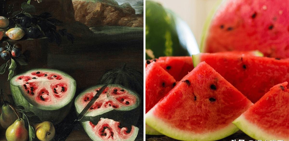 07 1645年油画中的西瓜,与现代经过育种的西瓜对比,如果现在西瓜是左边那副模样,估计没几个人会喜欢吃了。