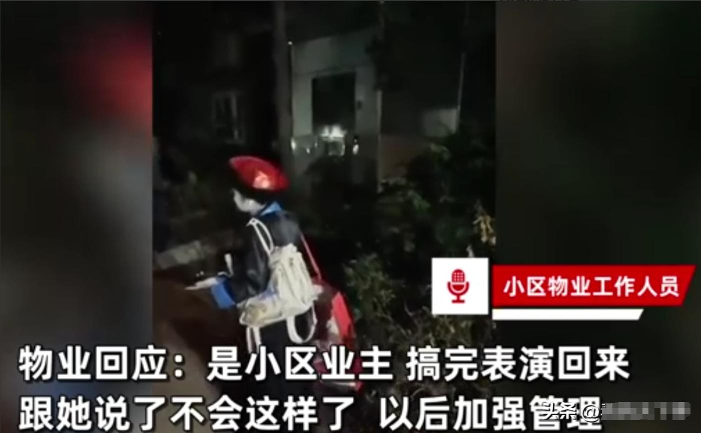 最令人意外的是,物业的回应。他们并没有给出严肃的处理意见,反而轻描淡写地回应称,“这位女士只是在参加一个派对,打扮成这样是为了娱乐,并无恶意。”这番话一出,许多居民和网友都炸锅了:“这可不是娱乐,这简直就是搞恐怖袭击啊!”