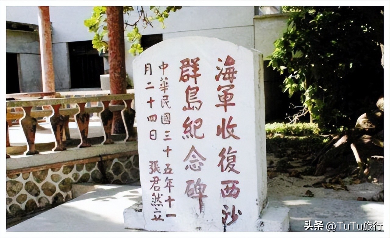 在兴岛上矗立着一块水泥石碑,正面是四个朱红的大字“卫我南疆”,反面是“海军收复西沙群岛纪念碑”,两行楷书镌刻得遒劲有力。纪念碑位于距离永兴岛上港口三百米远的树林里,高接近1.5米,宽接近1米,这块古朴的石碑看似平平无奇,却有着极其重大的历史意义。这块石碑的矗起标志着西沙群岛是我国永远不可分割的领土,它傲然耸立在永兴岛上,守望着潮起潮落,成为我国固有神圣领土西沙群岛上的历史证物,捍卫着祖国领土主权。