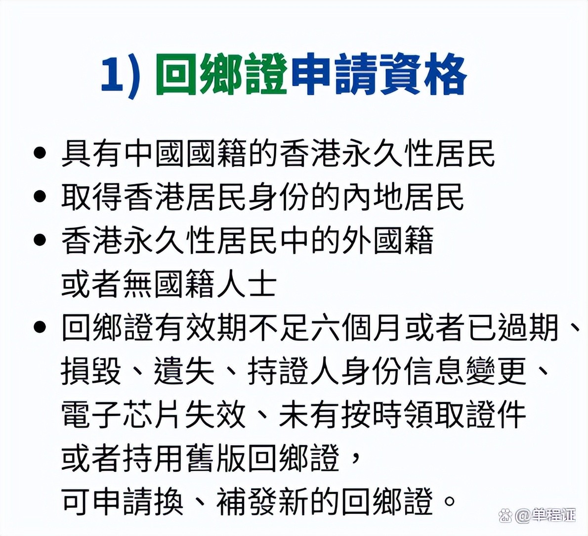 在香港出生,具有中国国籍的香港永久性居民。内地居民经批准赴香港定居,取得香港居民身份的。在香港以外出生的中国籍居民,已确立香港永久性居民身份的。香港永久性居民中的外国籍或者无国籍人士,经批准加入或恢复中国国籍的。香港居民所持回乡证有效期不足六个月或者已过期、损毁、遗失、持证人身份信息变更、电子芯片失效、未有按时领取证件或者持用旧版回乡证需要换领新版回乡证的,可申请换、补发新的回乡证。