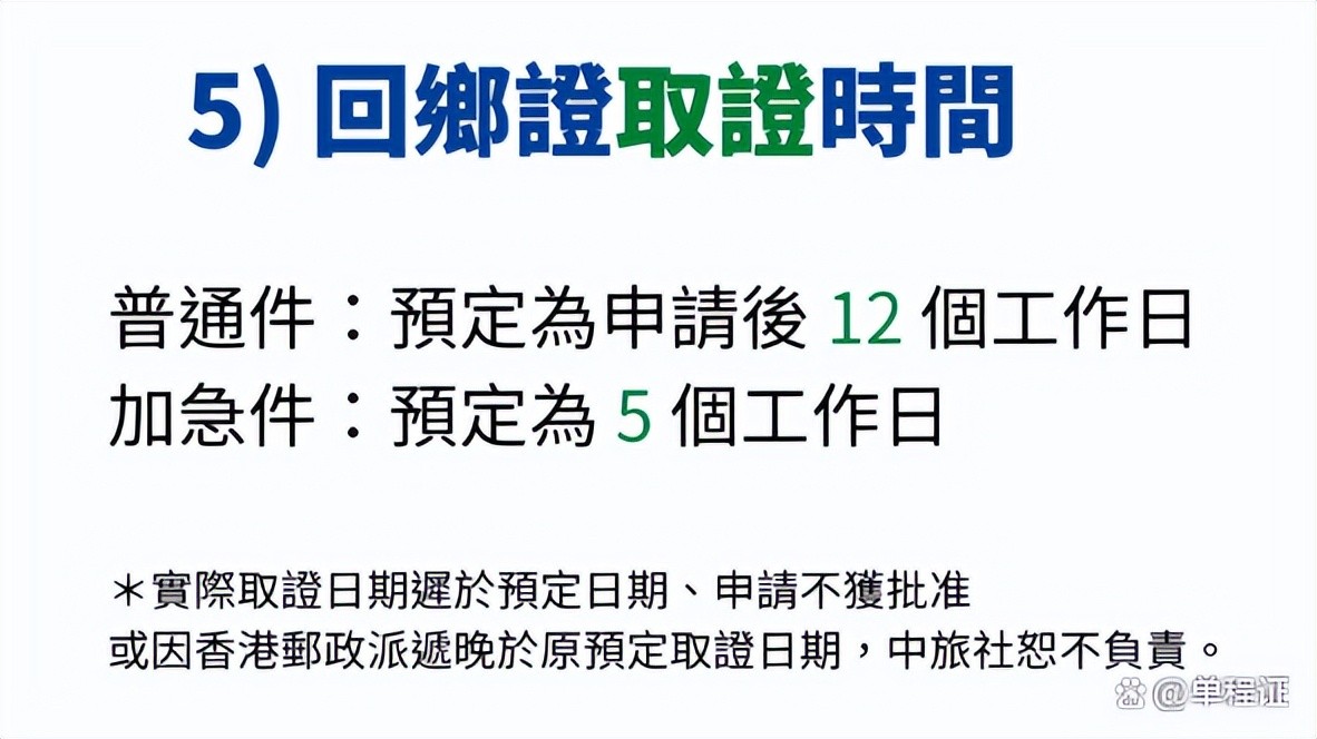 申请人可自费选用香港邮政本地邮政速递服务领取证件,或在预定取证日期以后,到提交申请的中旅社取证。取证时,须提交旧回乡证或香港身份证。