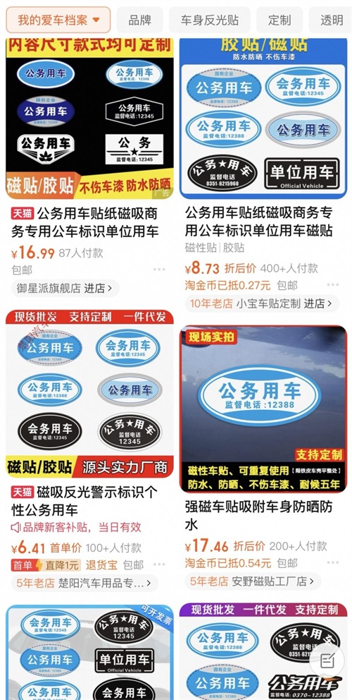 澎湃新闻记者查询到,在淘宝等电商平台上均有大量“公务车贴”出售,最低仅需5元钱,不仅消费者可以随意购买粘贴,甚至还可以定制监督电话。