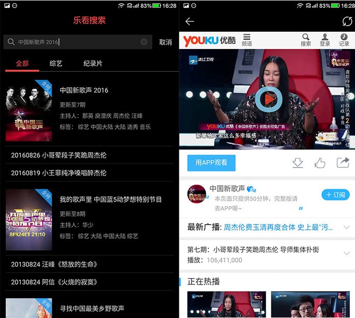 试了试中国新歌声,优酷的视频也被找出来了。是不是很牛。