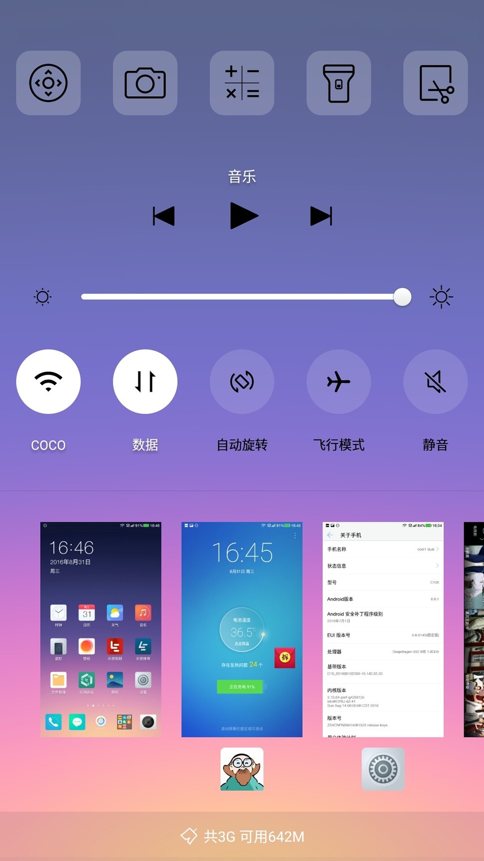 可以看到界面比较类似苹果。EUI的多任务集成了常用工具、音乐设置、