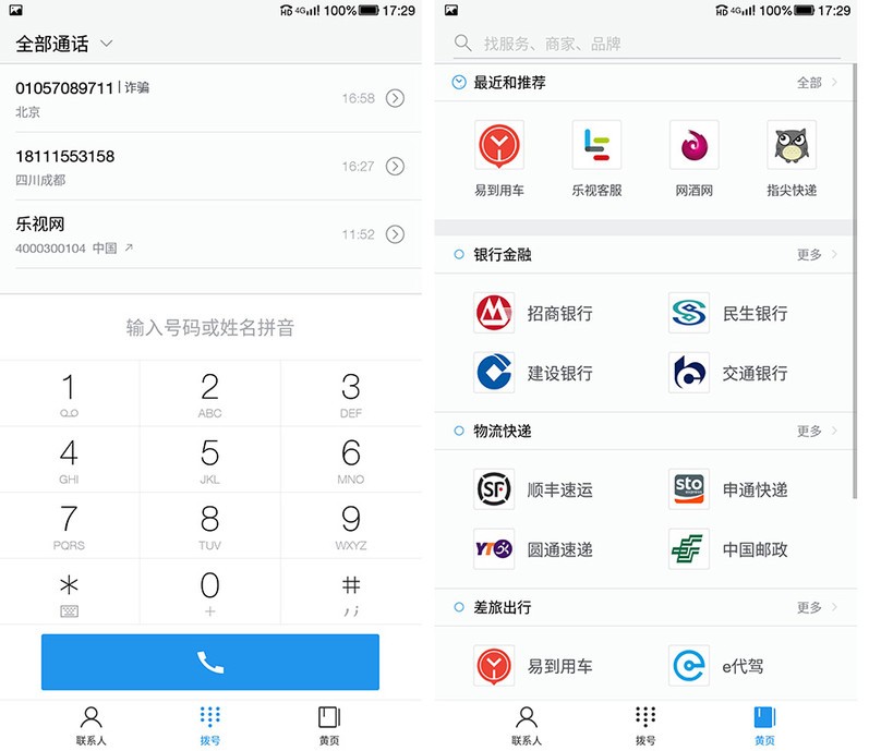 点击右侧“黄页“ 即可进入EUI通话黄页界面。银行金融、物流快递、差旅出行、外卖美食都能轻松查找。