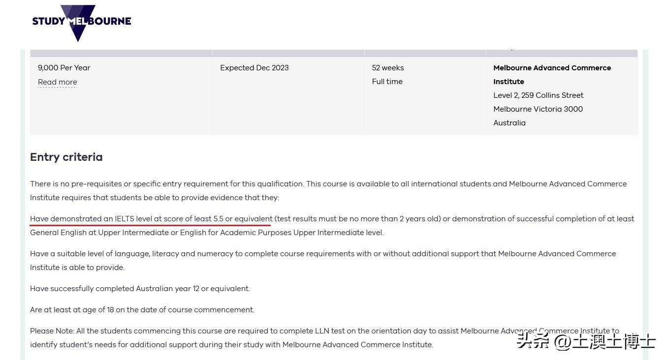 大家能发现,中介给他申请的学校是墨尔本一技校Melbourne Advanced Commerce Institute。目前这学校的网站是打不开的,但是能从studyMelbourne网站进去看到该学校的课程。但是,每个课程的入学要求都包含英语雅思5.5以上,而澳洲移民局对学生签证是有英语水平要求的,见下面两图红线部分。
