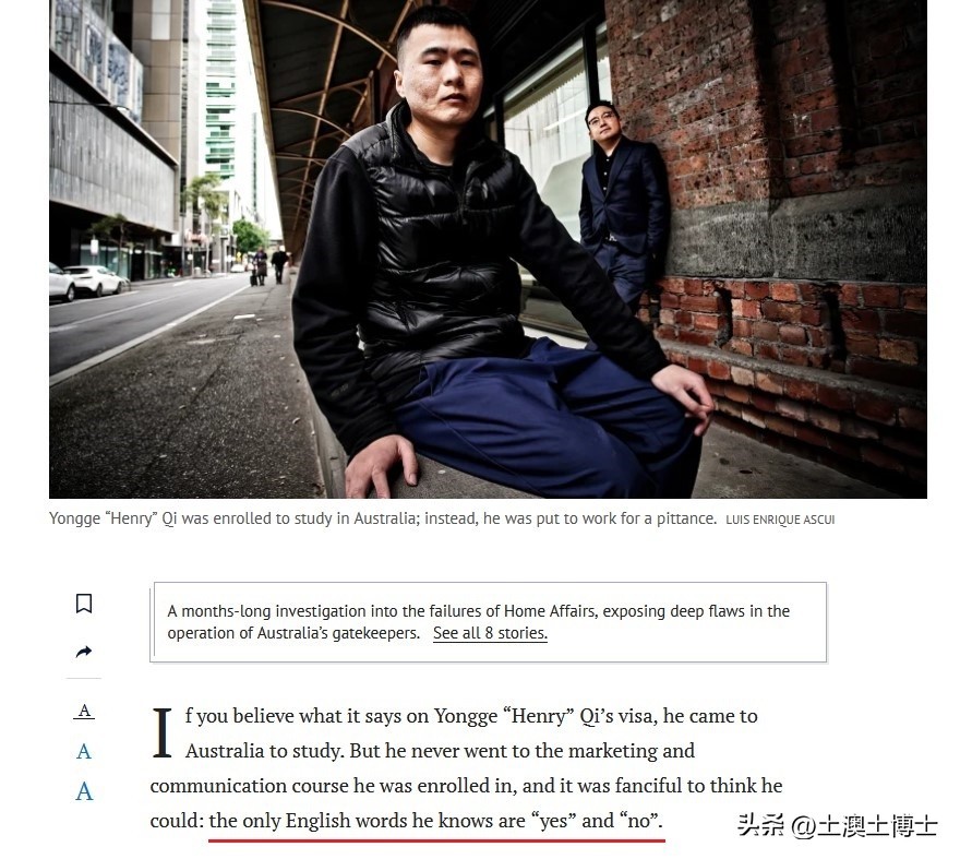 最后告诫大家:有些大中介即使是正儿八经办理过真实的签证,不代表他们就不会作假坑人。如果你持澳洲学生签证,请老老实实去读书不要去打黑工。如果你持澳洲旅游签证,请老老实实去旅游不要打黑工。如果你想去澳洲打工或移民,请走正规通道,不要被中介忽悠去弄虚作假。除非你是北极鲶鱼,不然如果想在澳洲找份好工作,过上好生活,请先学好英语。