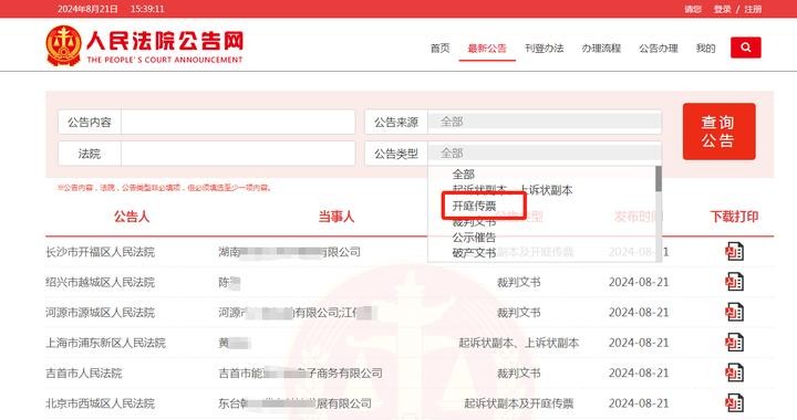 这个网站有很多类型的公告都可以查询,不仅有开庭公告、还有法院公告、送达公告、裁判文书、仲裁文书等信息。