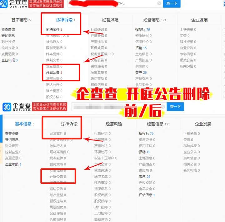 特别是一些企业,常常因合同纠纷产生司法案件,其中就包括开庭公告,有时候已经和解了,但是开庭信息依然在“庭审公开网”“地方法院”“企查查、天眼查”等平台展示。会对公司的形象和业务产生一定的影响。