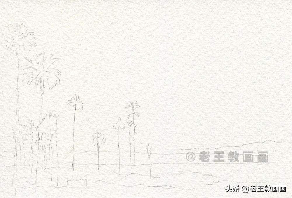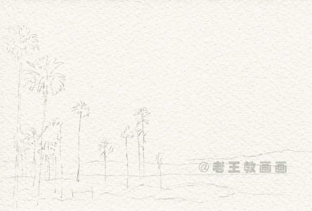 >>>【第1步】:画前分析,画彩铅风景不用死磕细节,画出大的色彩关系就可以。用铅笔轻轻的起型打底稿,根据纸张的大小确定风景中树、地面和海面的比例位置(p1)↓