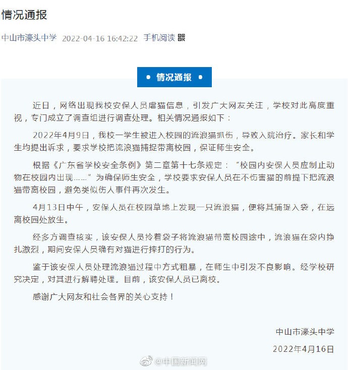 近日,网传广东省中山市濠头中学安保人员虐猫。该校16日通报称,学校安保人员13日在校园发现一只流浪猫,便将其捕捉入袋,在远离校园处放生。该安保人员将流浪猫带离校园途中,流浪猫在袋内挣扎激烈,期间安保人员确有对猫进行摔打的行为。鉴于该安保人员处理流浪猫过程中方式粗暴,在师生中引发不良影响。学校研究决定,对其进行解聘处理。(中山市濠头中学)