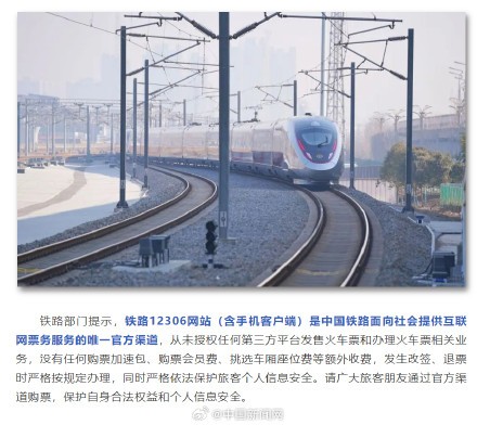 铁路部门提示,铁路12306网站(含手机客户端)是中国铁路面向社会提供互联网票务服务的唯一官方渠道,从未授权任何第三方平台发售火车票和办理火车票相关业务,没有任何购票加速包、购票会员费、挑选车厢座位费等额外收费,发生改签、退票时严格按规定办理,同时严格依法保护旅客个人信息安全。请广大旅客朋友通过官方渠道购票,保护自身合法权益和个人信息安全。(中国铁路)