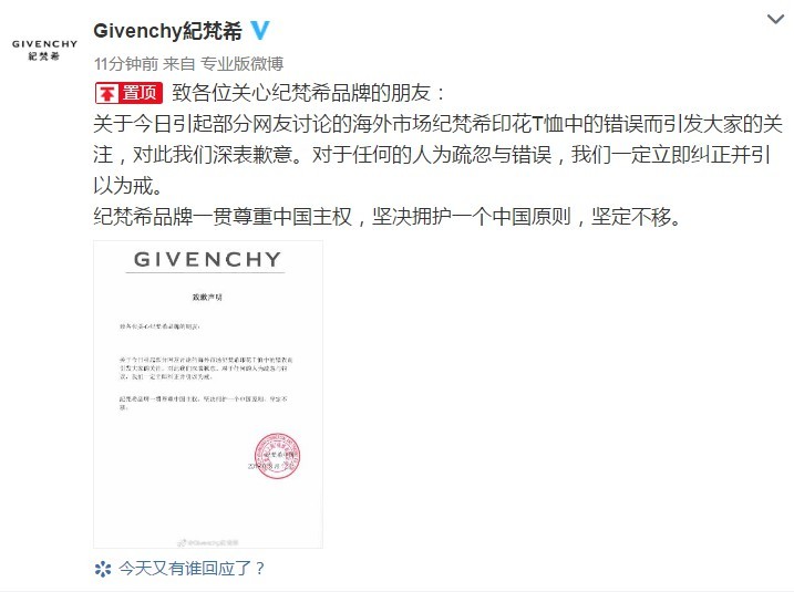 纪梵希道歉:品牌一贯尊重中国主权,立即纠正并引以为戒