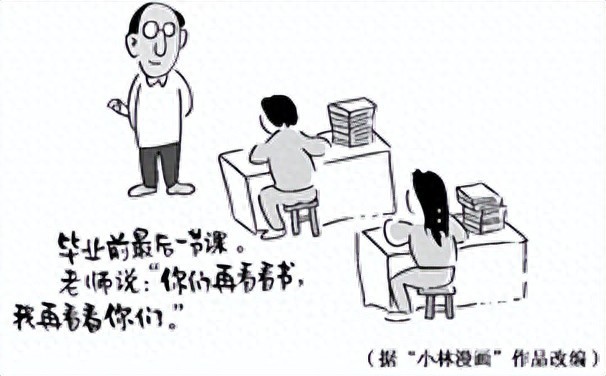 这是一道漫画型材料作文题。漫画材料由两部分组成。一部分是图画:一位老师站立着,两名学生在各自的课桌上学习,课桌上各放着一摞学习材料。一部分是文字:毕业前最后一节课。老师说:“你们再看看书,我再看看你们。”