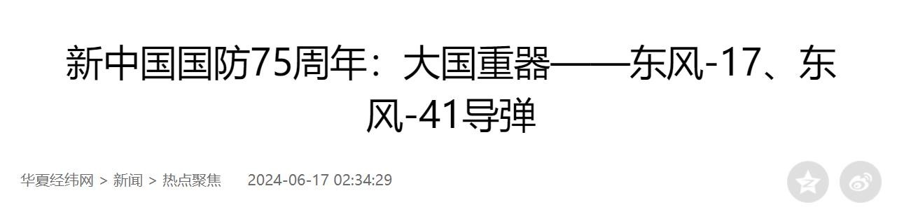 华夏经纬网在 2024年6月17日关于《新中国国防75周年:大国重器——东风-17、东风-41导弹》的报道