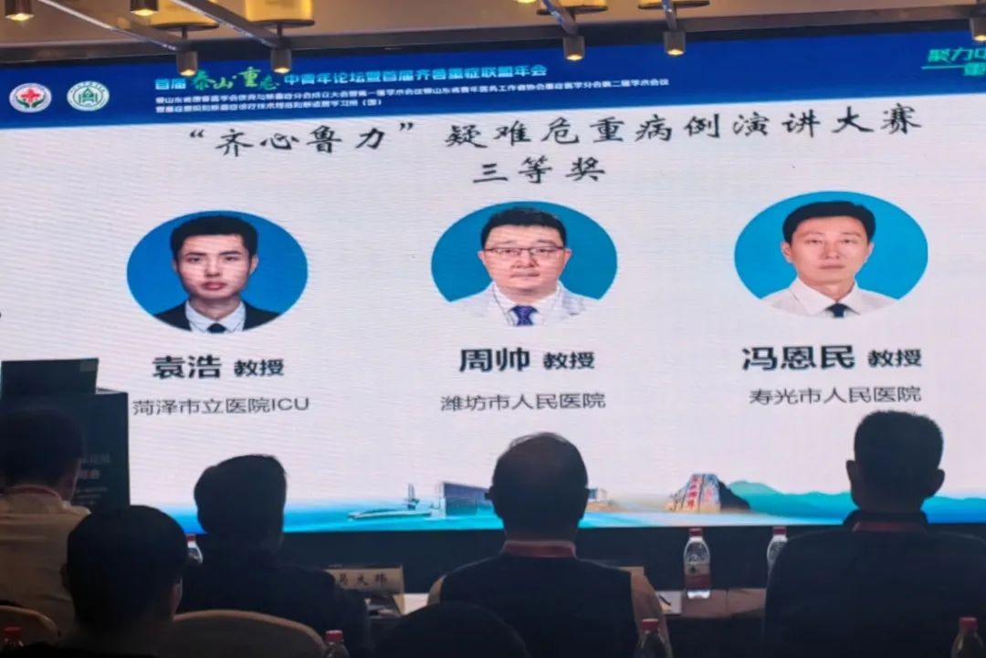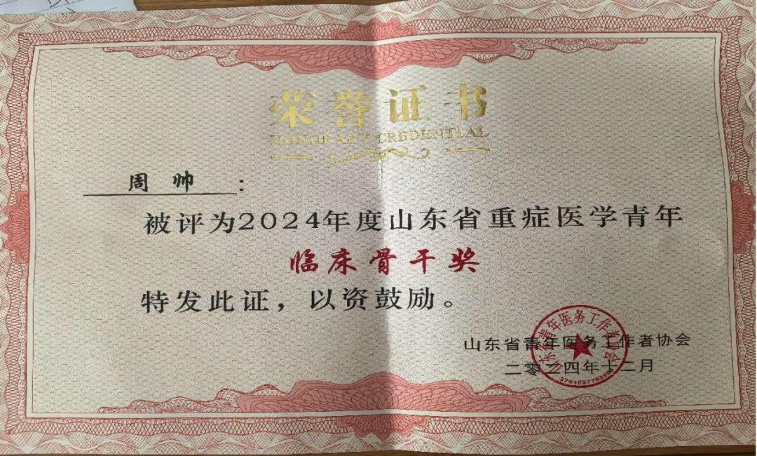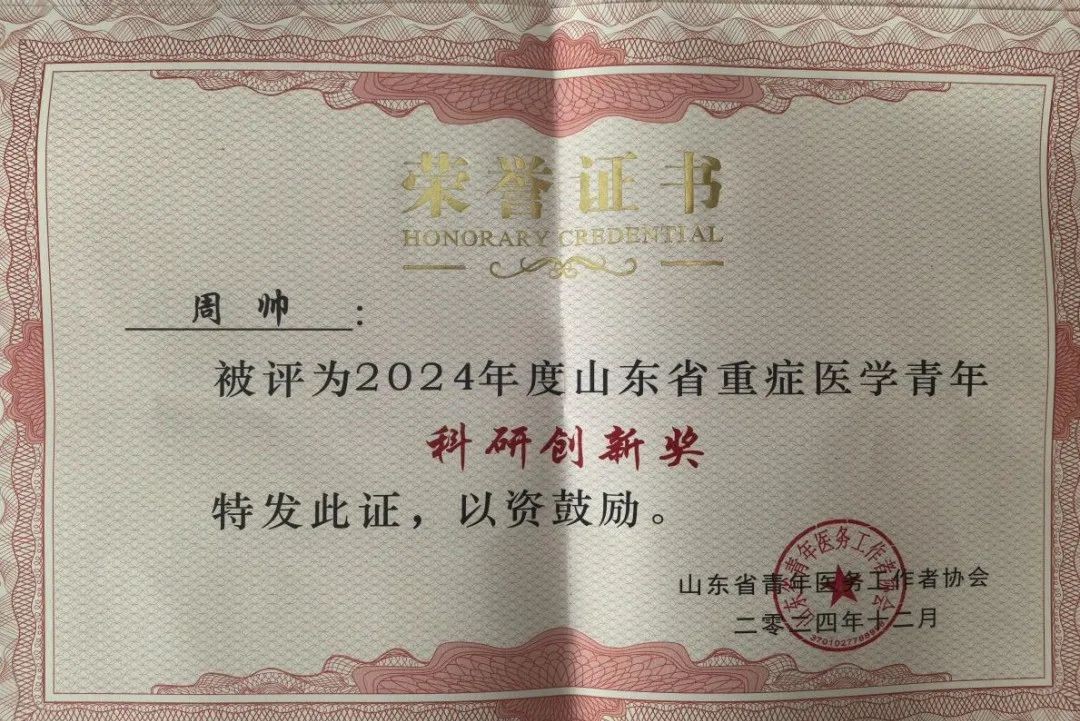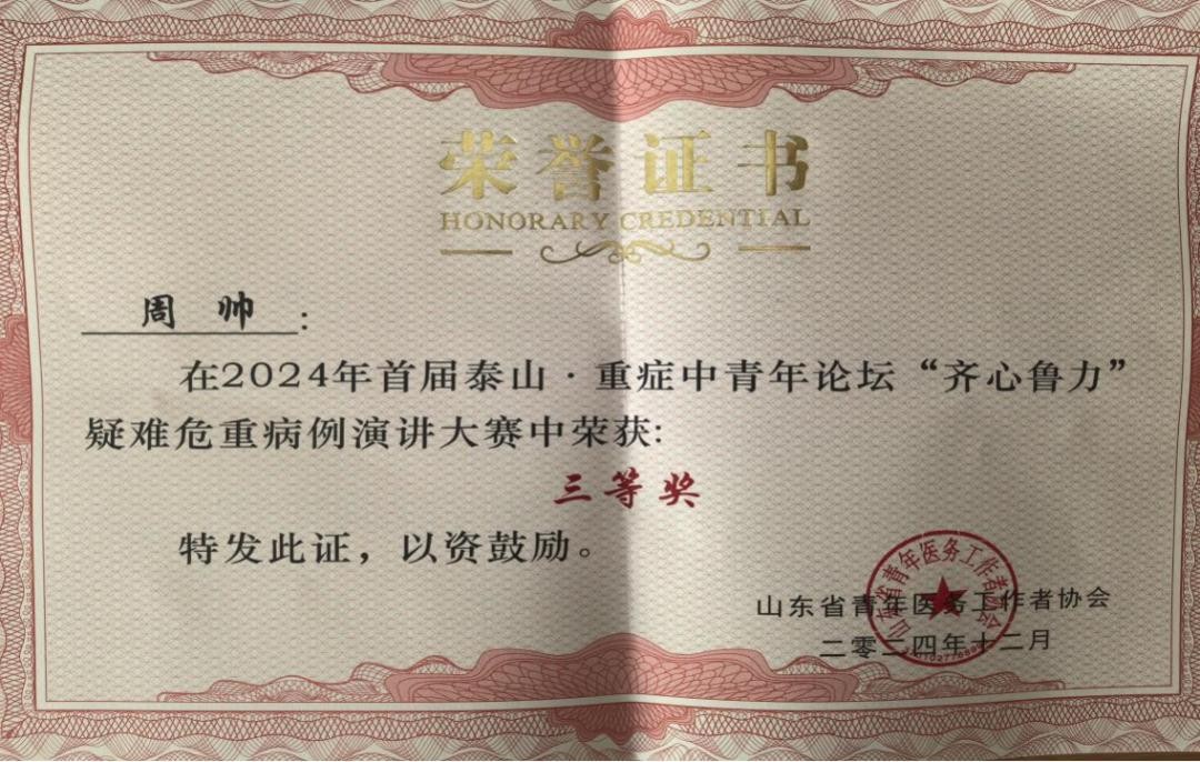 近日,在首届泰山重症中青年论坛暨首届齐鲁重症联盟年会上,重症医学科主治医师周帅获得获“青年临床骨干奖”和“青年科研创新奖”。
