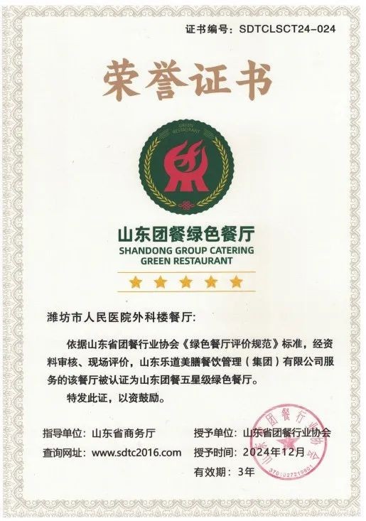 山东省团餐行业协会开展了2024年度山东省“绿色餐厅”创建评审工作,我院外科楼餐厅获评“山东团餐五星级绿色餐厅”。