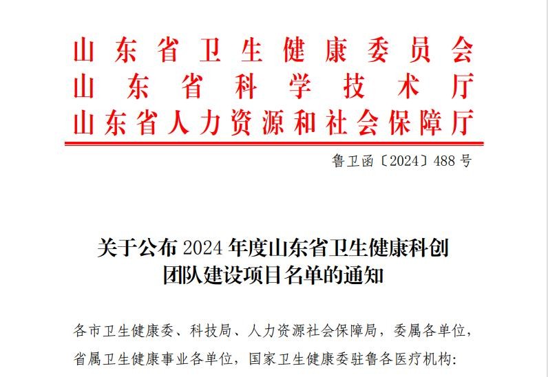 12月12日,省卫健委、省科技厅、省人社厅联合下达了《关于公布 2024 年度山东省卫生健康科创团队建设项目名单的通知》的通知,我院“免疫性疾病精准诊断与靶向治疗研发与转化团队”(团队带头人:徐栋花)和“潍坊市人民医院精准诊疗团队”(团队带头人:张云香)获批山东省卫生健康科创团队--领军科创团队建设项目。