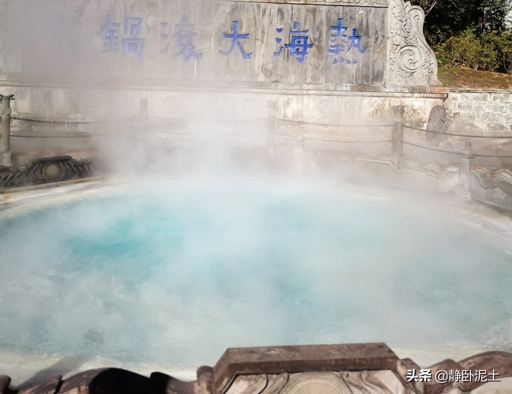 在热海景区,最为壮观的当属“热海大滚锅”,它是“热海的心脏”,直径6.12米,水深1.5米,水温高达96.6℃,为八角形的大沸泉,潭内池水澄碧,清澈见底,白浪翻滚,热气弥漫,形似一口烧开的巨锅,一年四季,昼夜沸腾……