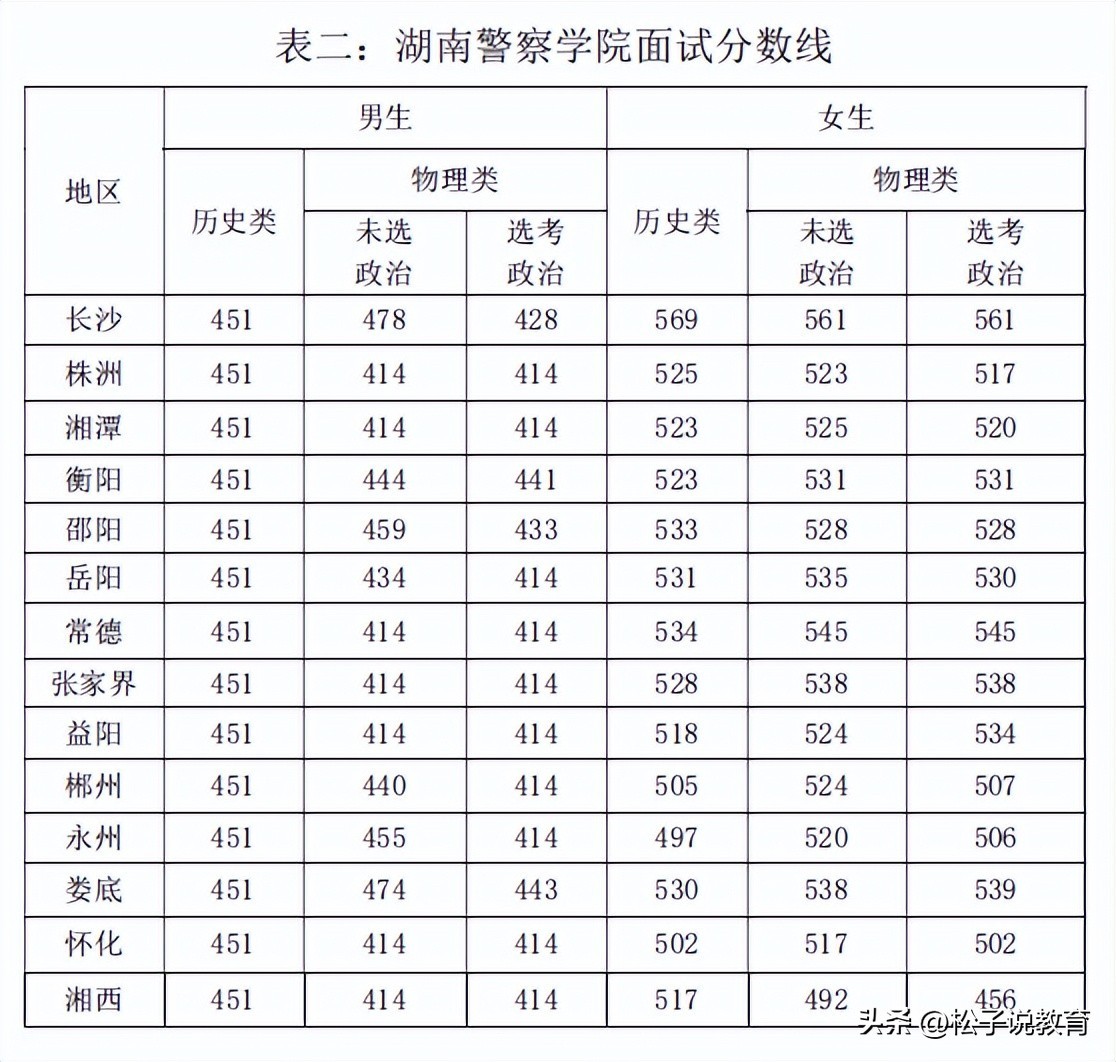 通过官微公布的面试分数线情况,我们可以很清楚地看到,选考历史类的男生,面试分数是451分,女生最低分是497分,最高分是569分;选考物理类的分成未选政治和选考政治两大类,未选考政治的男生最低分是414分,最高分是478分;女生最低分是492分,最高分是561分;选考政治的男生最低分是414分,最高分是443分;女生最低分是492分,最高分是561分。