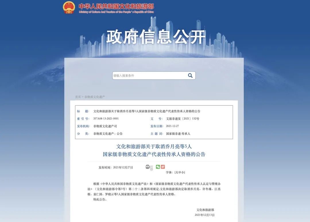 12月27日,文化旅游部官网发布了《取消乔月亮等5人国家级非物质文化遗产代表性传承人资格》的公告。