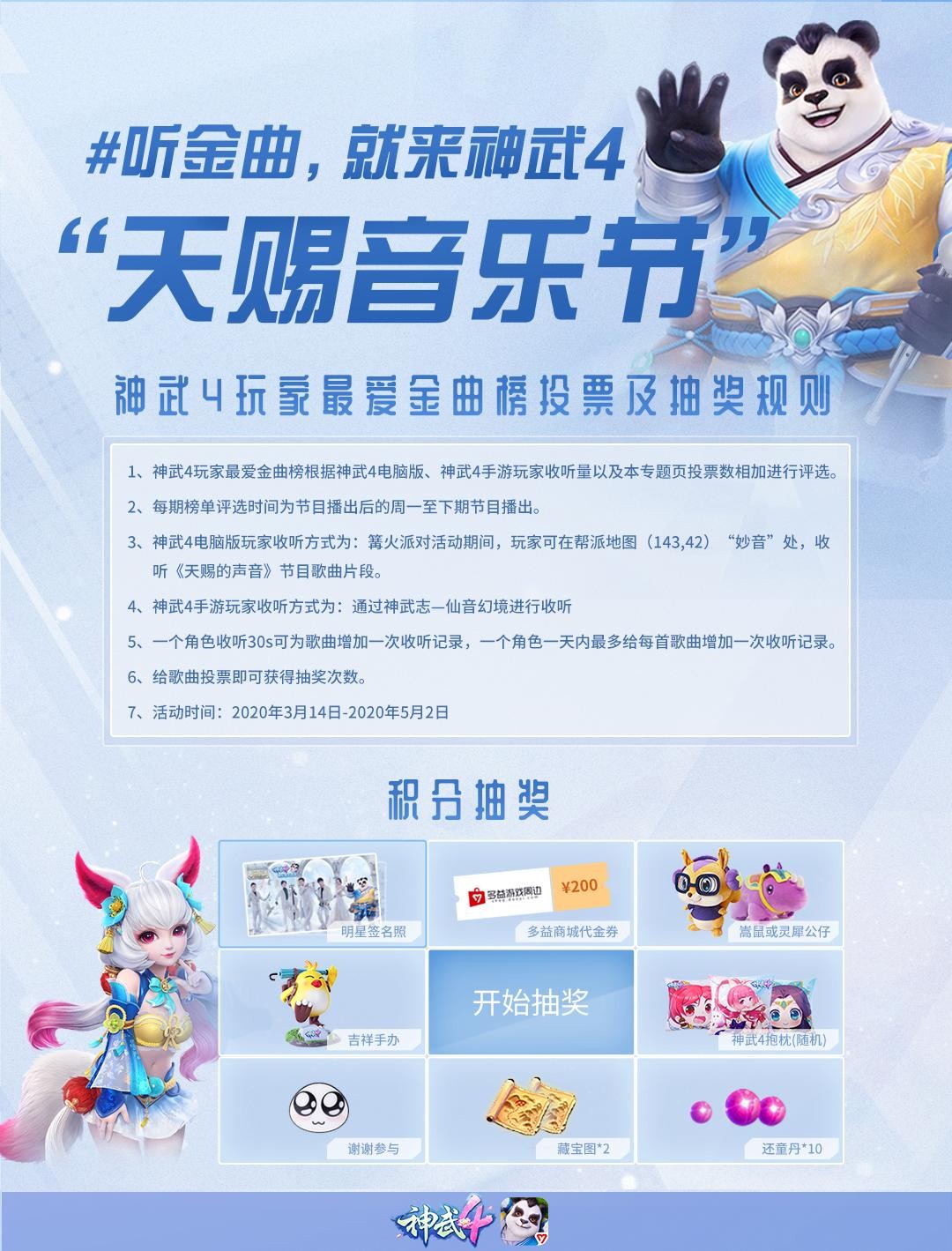 虽然在节目中阿肆和吴青峰演唱的《别找我麻烦》没有获得当期的金曲,但是当期的金曲还是非常好听的,王力宏和那吾克热的合作让人影响深刻。在节目与《神武4》联手打造的"天赐音乐节"中,小伙伴们可以在活动的专题页面找到自己喜欢的金曲,为它们投票打卡,参与活动的玩家还可以进行抽奖,有几率获得胡海泉,张韶涵,苏有朋,王力宏,胡彦斌,吴青峰,胡夏,汪苏泷,李紫婷,尤长靖的签名海报以及许多游戏相关的周边福利。