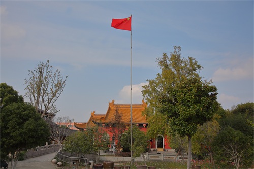 北侧的大殿,中间是迎风飘扬的五星红旗,两侧是银杏树,中间是一座桥。