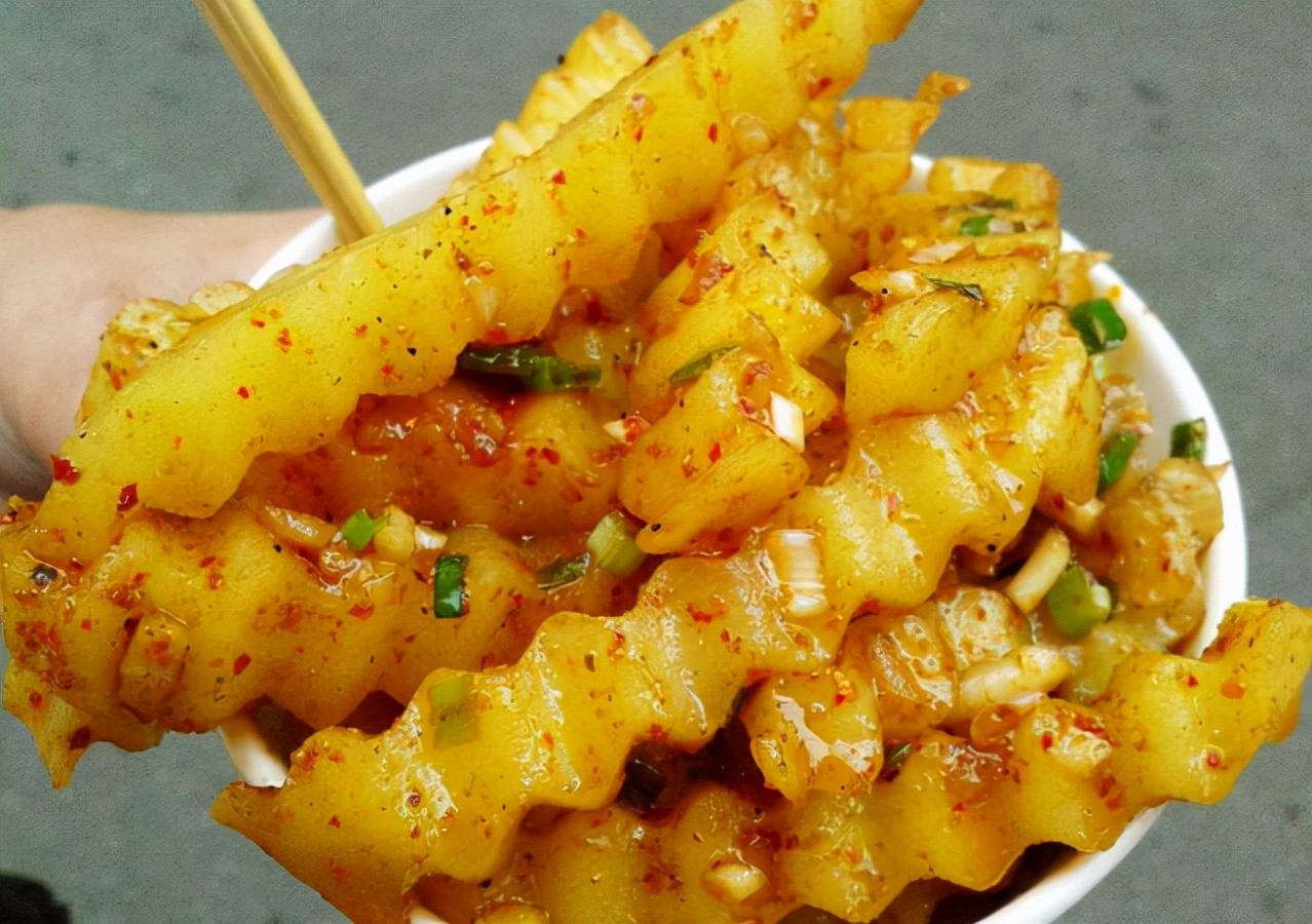 可能我们在全国各地也会吃到狼牙土豆,而它真正的发源地是四川乐山,是在天蚕土豆的基础上改进而来,它的主要食材还是土豆,用特制的刀具把土豆切成波浪外形,看着像犬齿,所以得此名,基本上走在乐山街边都能吃到,现炸现卖,搭配上佐料,要比麦当劳的薯片好吃。