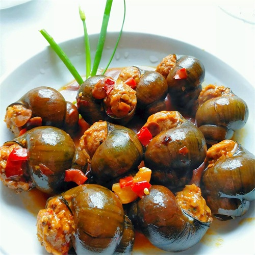 广西人爱吃田螺也会吃田螺,因为得天独厚的地理位置与气候等条件,广西出产先上好的大田螺,敲掉螺尾煮熟,将猪肉、木耳等配料剁成馅酿入田螺内,再和鸡肉、螃蟹一同下锅煮熟即可。其特点是味美鲜甜,营养丰富。