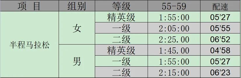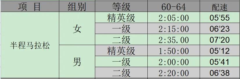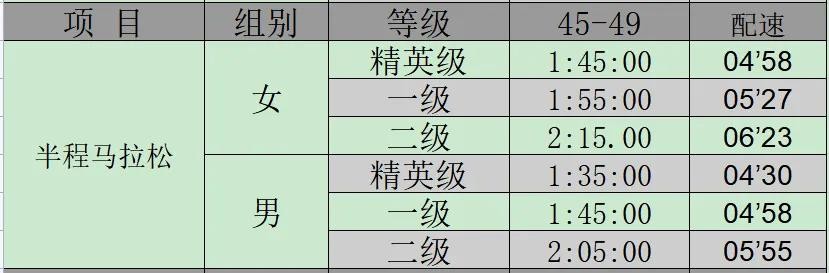 一级标准:女子1:45(配速4'58),男子1:35(配速4'30),也基本接近以前的精英级成绩了。