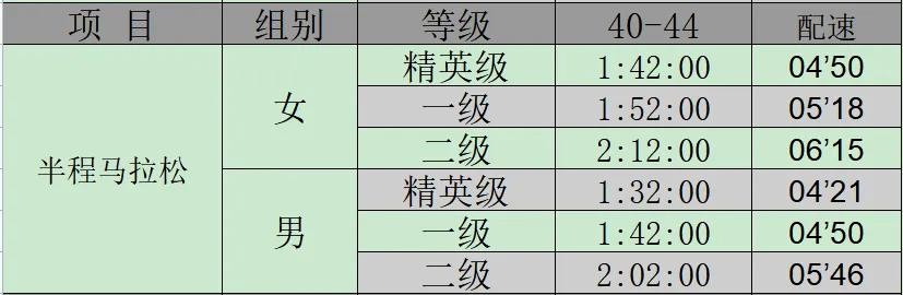 精英级:女子1:45(配速4'58),男子1:35(配速4'30)。