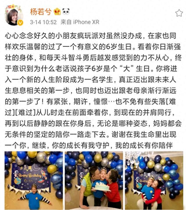 3月14日,知名演员杨若兮在自己公众平台分享了一组为儿子庆祝生日的合照,并配文:虽然没有为儿子办成心心念念的疯狂派对,但在家也同样很温馨的度过了一个很有意义的6岁生日等,感叹儿子已经6岁,即将迈入人生的新阶段。