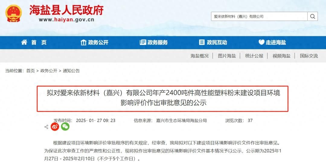 嘉兴市生态环境局海盐分局近日对外发布《拟对爱来依新材料(嘉兴)有限公司年产2400吨件高性能塑料粉末建设项目环境影响评价作出审批意见的公示》。