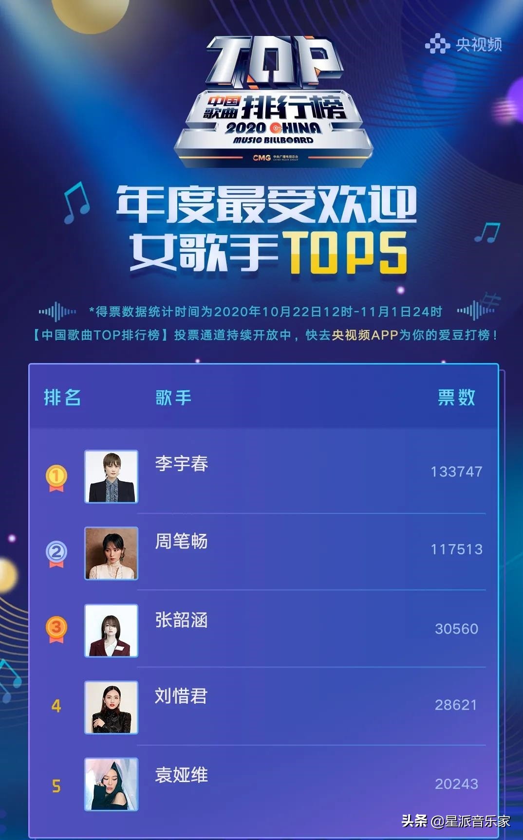 李宇春已经从当年的假小子蜕变成女人味十足的红毯常客,出演的影视作品虽然少,但每一个角色都让人印象深刻。在央视频最新的年度最受欢迎女歌手排行榜中,李宇春高居榜首,巧的是,第二位正是周笔畅。