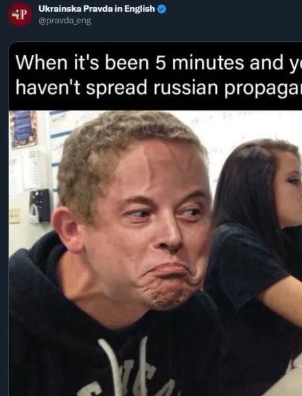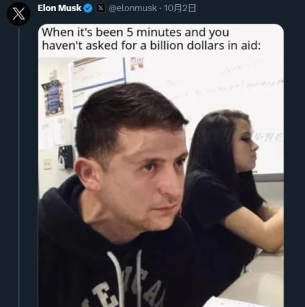 马斯克在10月2日发布的推文中分享了一张风靡全球社交媒体的表情包,描绘了一个男生在教室里憋得满脸通红、青筋暴起的情景。原本的标题是“试图在可爱女生旁边憋屁”,而马斯克将表情包中的男生P图成了泽连斯基,并将标题改成了“5分钟过去了,你还没张口要10亿美元援助”。