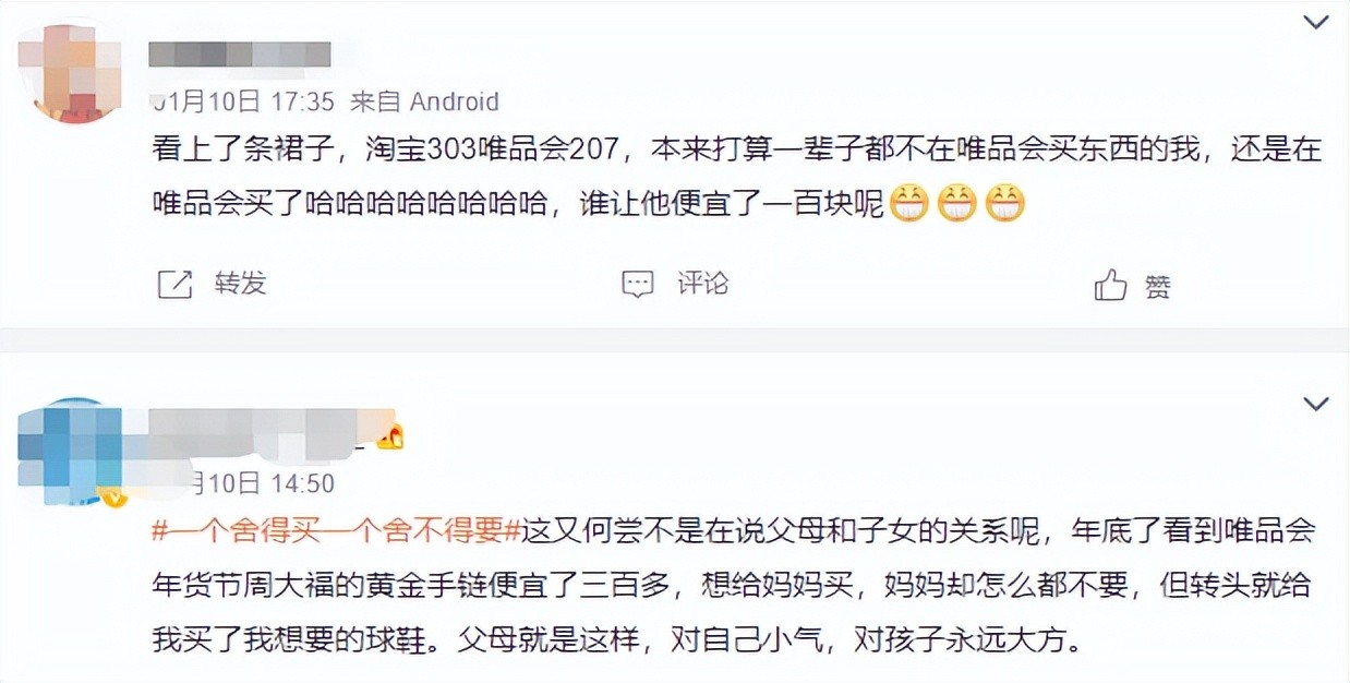 不少网友都有过经历,同样的东西唯品会价格比别家便宜一些。一位小姐姐看上的一条裙子,其他平台卖303元,唯品会特卖价207元,几乎便宜了1/3。另一位网友前不久在网上买周大福金手链,几个平台都看了发现唯品会便宜300多元。
