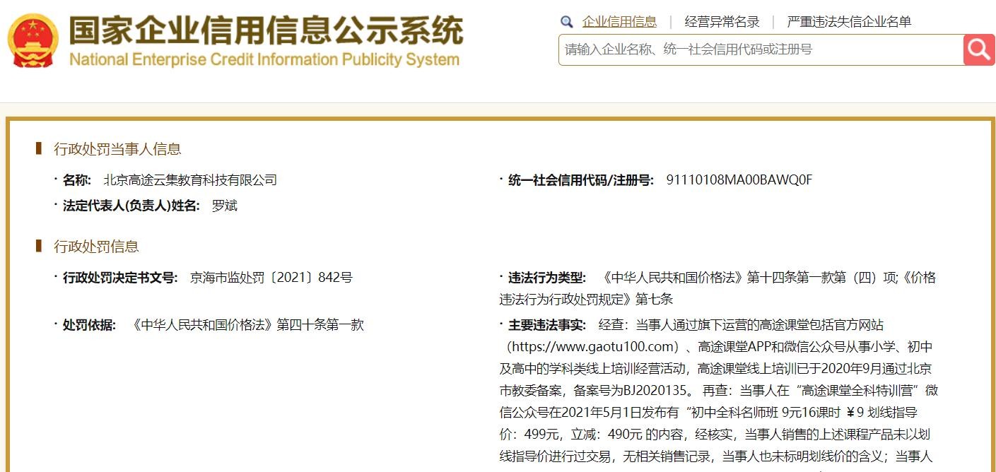 行政处罚信息显示,北京高途云集教育科技有限公司通过旗下运营的“高途课堂”,包括官方网站、高途课堂App和微信公众号,从事小学、初中及高中的学科类线上培训经营活动。