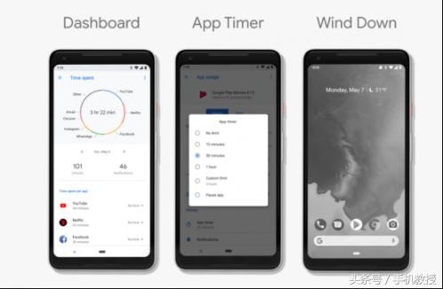 这回安卓P化身贴心小助手,推出了Android Dashboard功能,也就是“防沉迷系统”。系统内置一个“仪表板”应用,具有时间限制和提醒功能,这个应用会监测你每天用手机干了些啥,比如看电影、看视频、刷微信、玩游戏是否太多。结合App Timers,一旦到了限制时间,APP图标就会变成灰色,提醒你玩太久了该休息一下了。