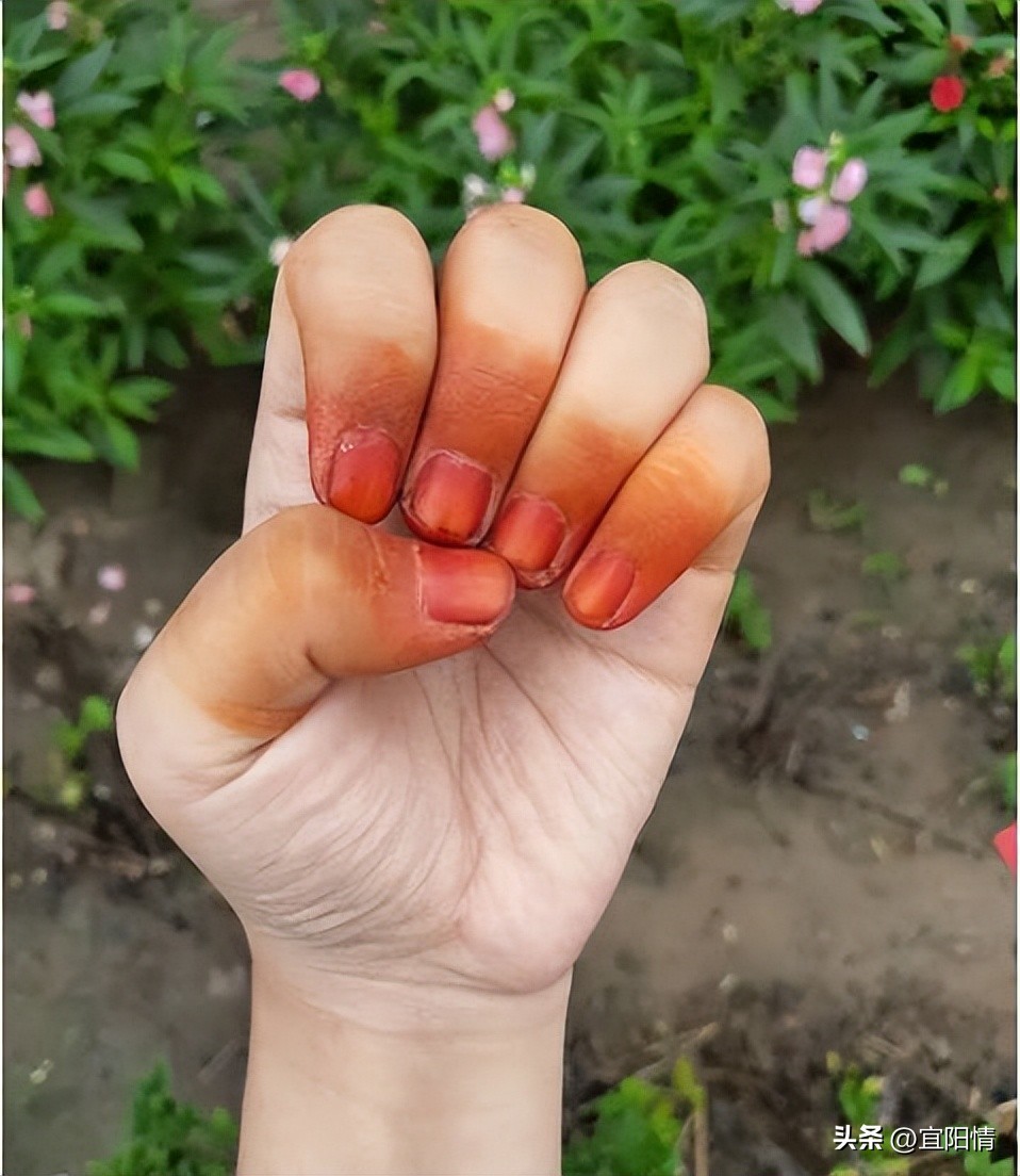 不同的颜色的花染出来的颜色肯定不一样。大红的奶奶最喜欢,说是像国旗的颜色,是老人家的一种朴实爱国主义情怀吧。妈妈喜欢啥颜色不知道,那时候孩子多,地里的活重,整天风风火火忙完地里忙家里,有时候难得闲下来也会给姐姐们或小妹包包指甲,但她自己好像不包。